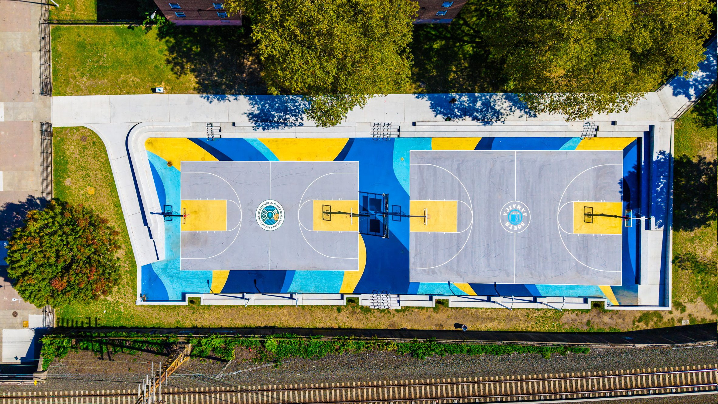 Aceste terenuri de baschet devin rezervoare pentru ape pluviale în caz de inundații