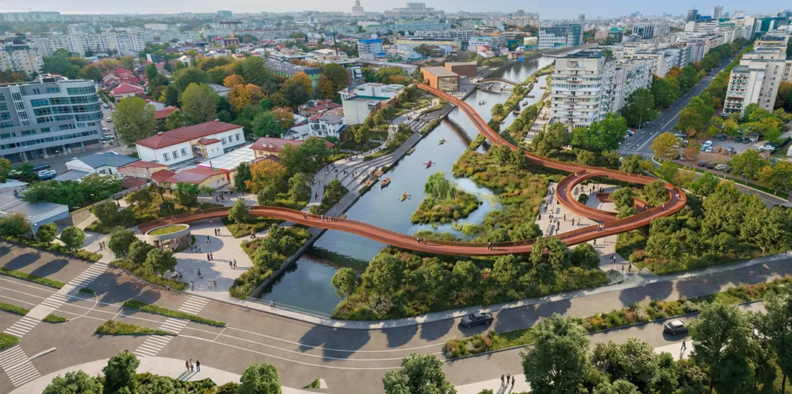 Râul Dâmbovița, astăzi o cuvă rigidă de beton, capătă o nouă perspectivă urbană în urma concursului internațional „Dâmbovița 2035”. Șase proiecte câștigătoare propun transformarea celor 30 de kilometri de curs fluvial într-un coridor verde-albastru ce reduce temperatura orașului, aduce acces real la apă și reactivează zone astăzi neglijate. Un concurs pentru reconectarea orașului cu apa […]