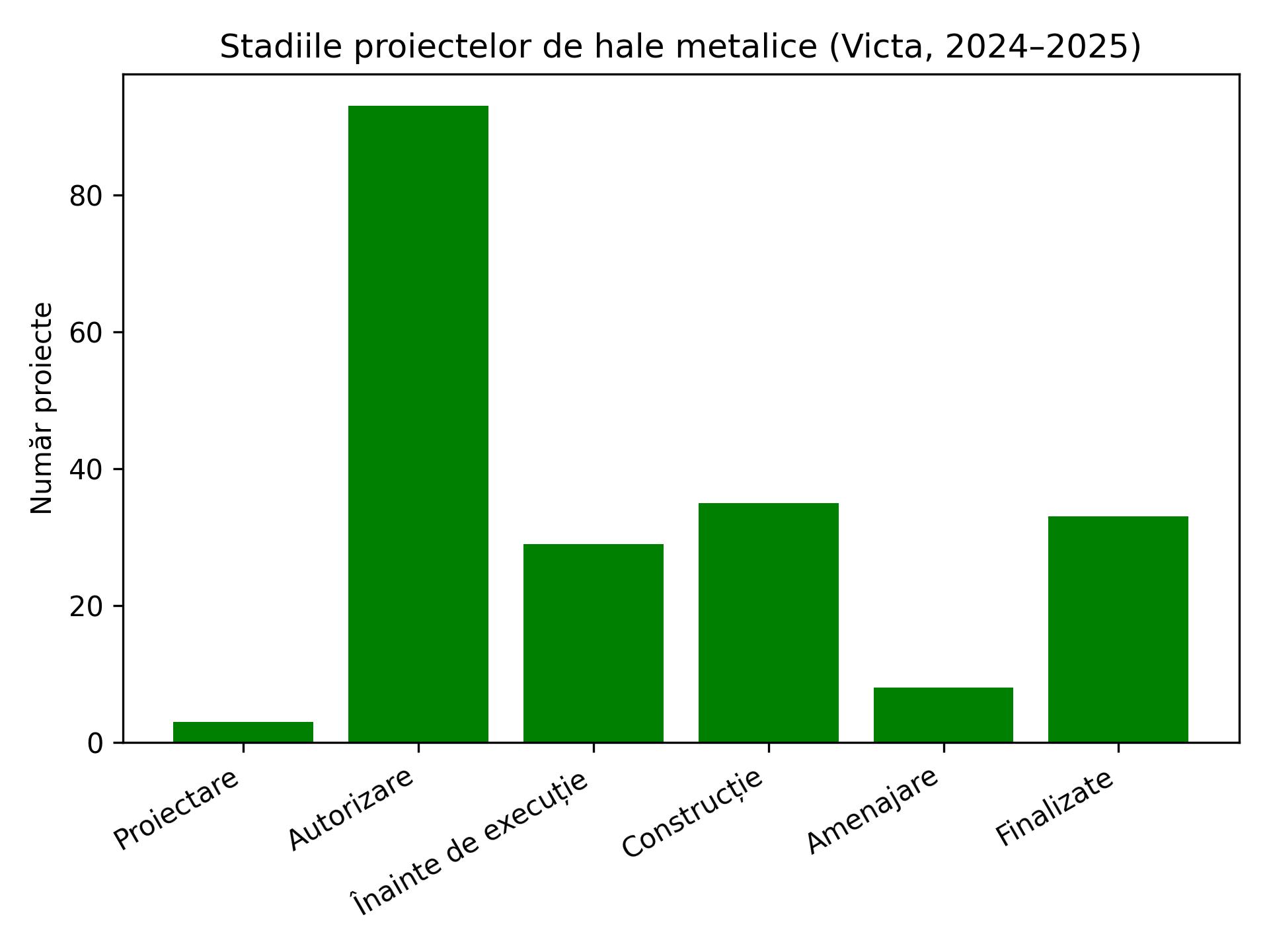 În perioada 22 decembrie 2024 – 22 decembrie 2025, Victa a monitorizat 201 proiecte de hale metalice în România, cu o suprafață totală de 136.248 mp și o valoare estimată la 395,20 milioane RON.