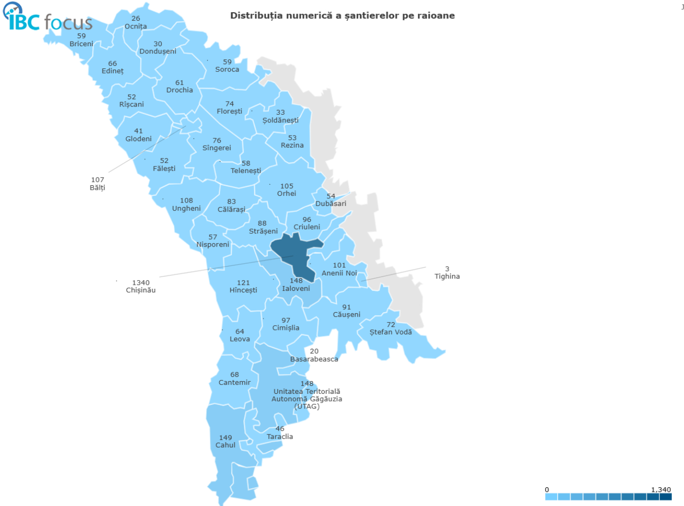 Din punct de vedere geografic, Chișinăul rămâne principalul pol de dezvoltare, concentrând 1.340 de proiecte, o cifră ce confirmă statutul capitalei ca motor economic și urbanistic.