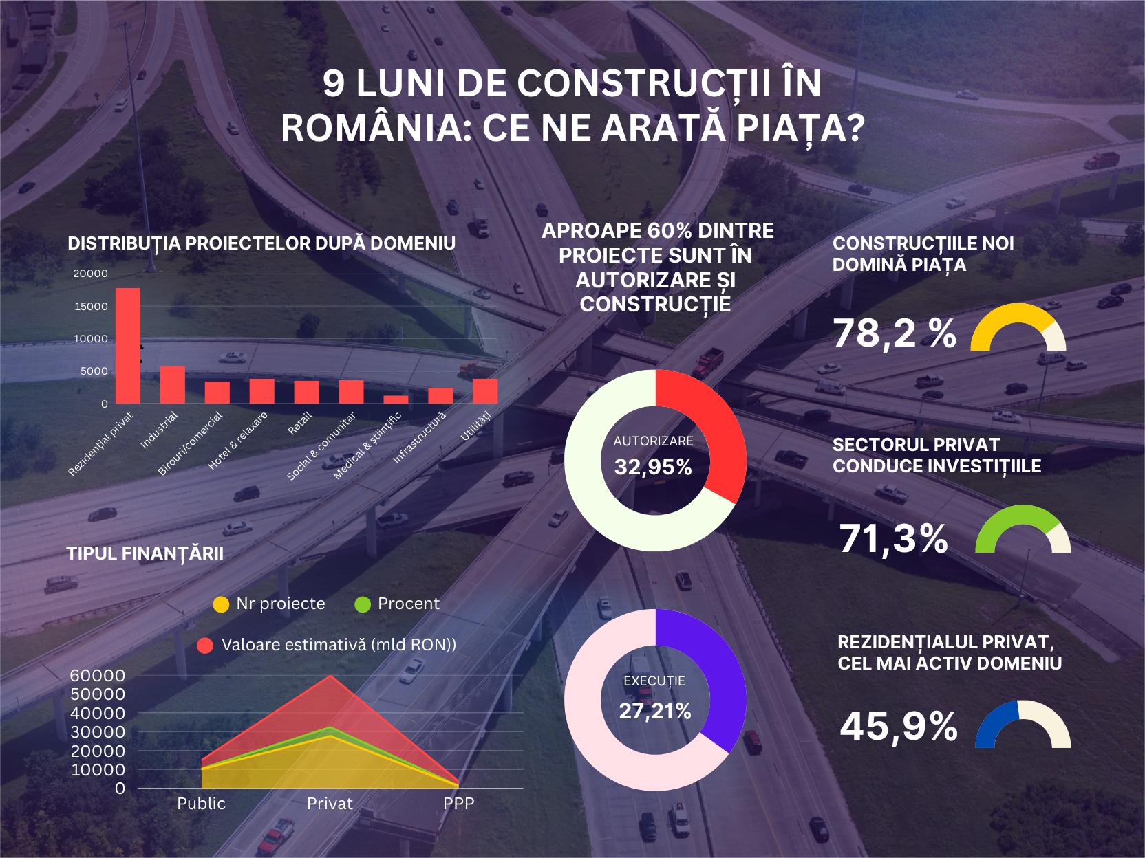 Majoritatea proiectelor sunt construcții noi aflate în faze avansate, iar investițiile publice semnificative (în special pe infrastructură) continuă să alimenteze expansiunea.