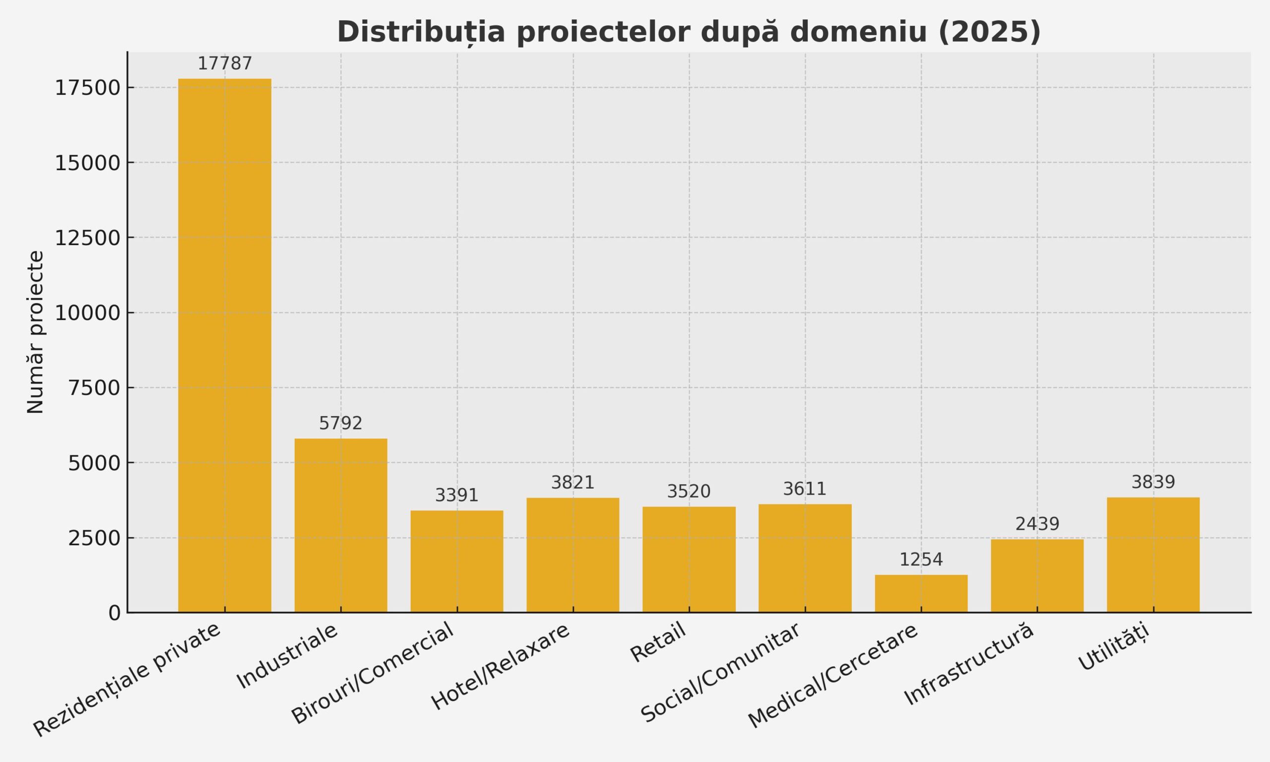 Cele mai numeroase sunt proiectele rezidențiale private și industriale. Totuși, creșterea în rezidențial este moderată (+9,7% brut în 7 luni) comparativ cu lucrările inginerești (+16,3%). Domeniile social și de utilități reflectă implicarea statului în infrastructura publică (școli, spitale, rețele tehnico-edilitare).