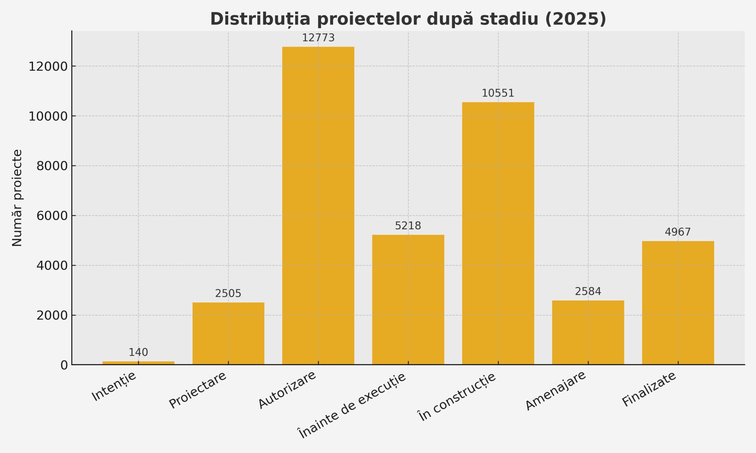 Aproape 23.324 proiecte (60% din total) sunt în fazele de autorizare și execuție, indicând un volum substanțial de lucrări viitoare.