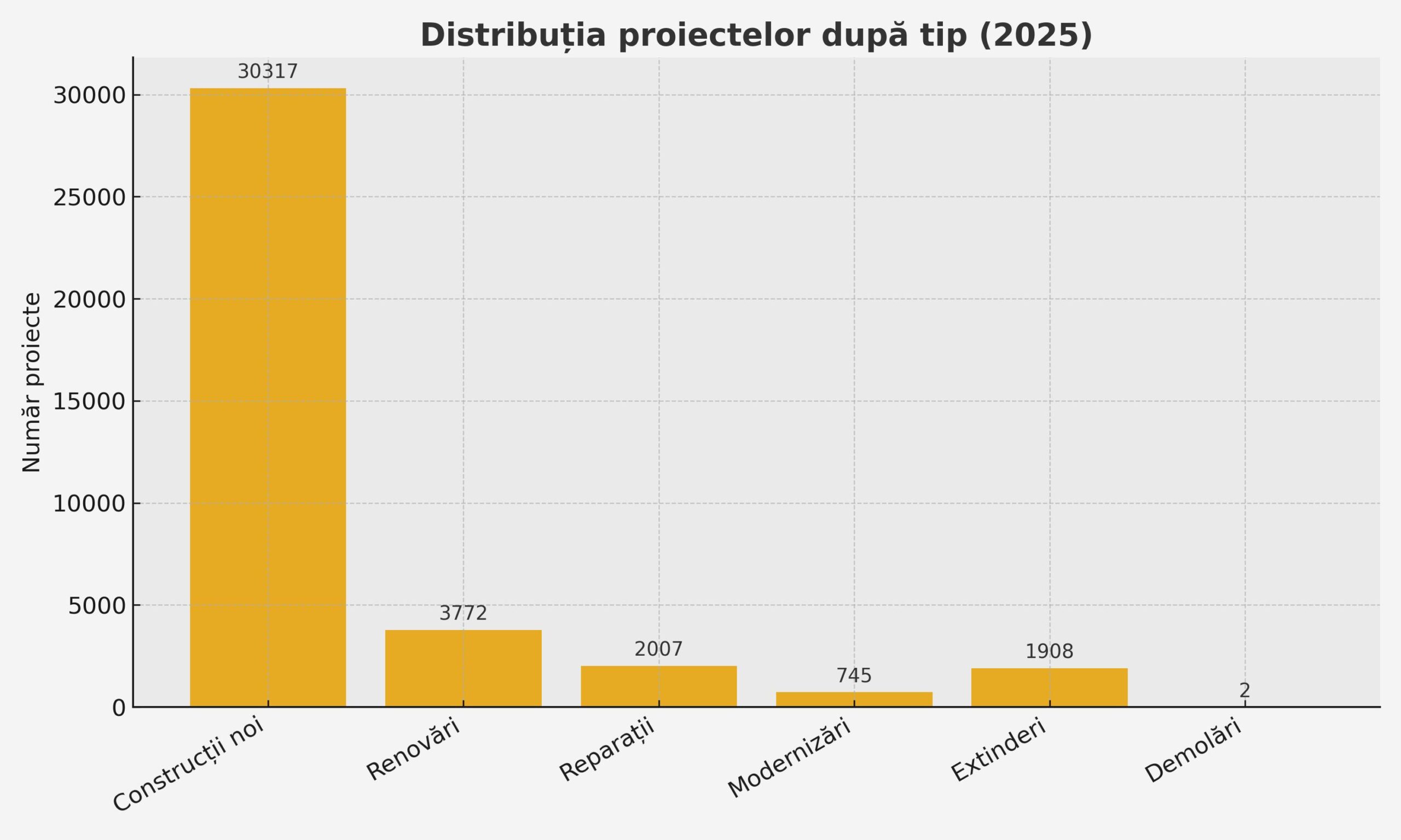 Construcțiile noi domină (aproximativ 78% din total). Segmentul rezidențial privat, deși cel mai numeros, cu 17.787 proiecte, a înregistrat creșteri modeste: INS raporta doar +2,3% în volumul clădirilor rezidențiale în primele 5 luni 2025, semn că cererea pentru locuințe noi rămâne moderată.