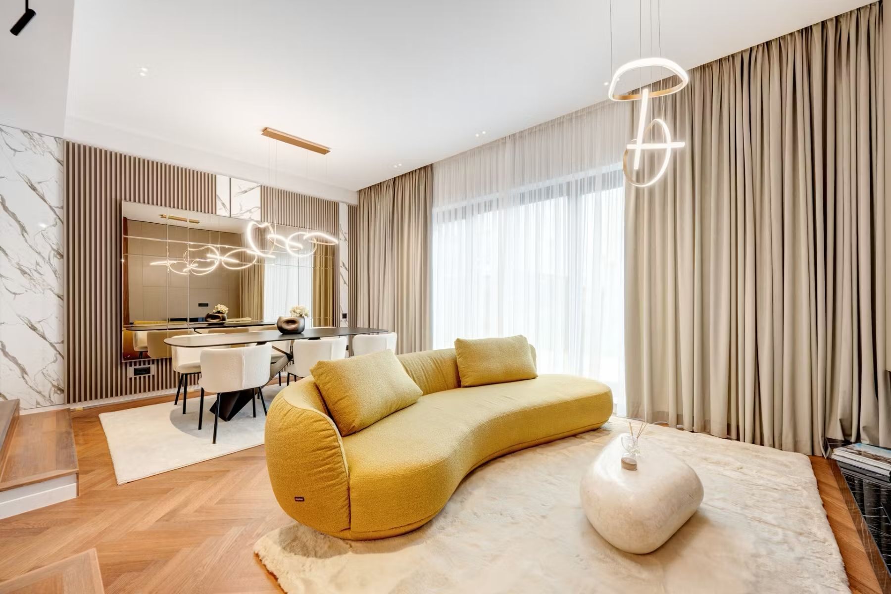 În zona de proiecte custom made, se observa tot mai des o îndepărtare de configurațiile rigide și o orientare către linii fluide, forme organice și soluții construite special pentru spații atipice. Aceste configurații nu sunt o tendință în sine, ci o consecință firească a personalizării reale, atunci cand mobilierul este gândit să se adapteze spațiului, nu invers.