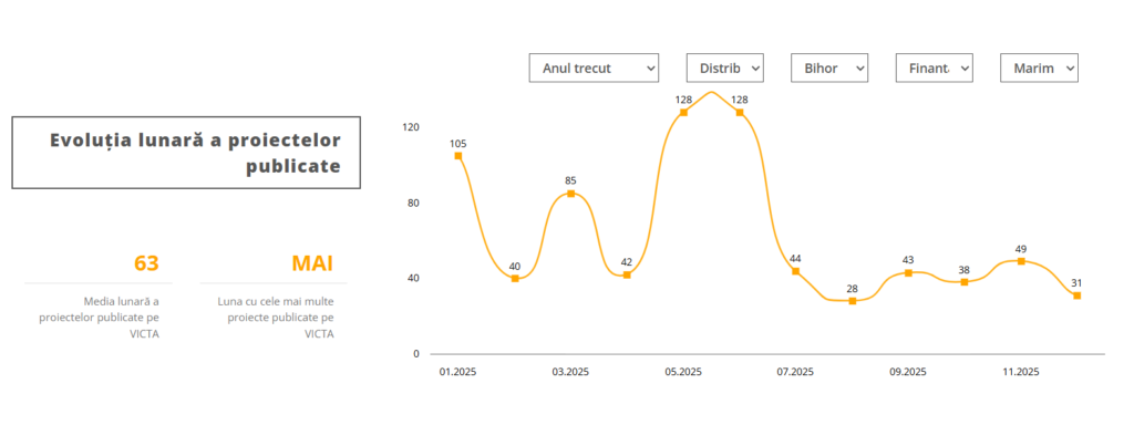 Totuși, momentul care redefinește întreg anul este octombrie, lună în care județul înregistrează 281 de proiecte publicate. După acest vârf, piața se temperează, dar rămâne activă, cu 119 proiecte în noiembrie și 81 în decembrie.