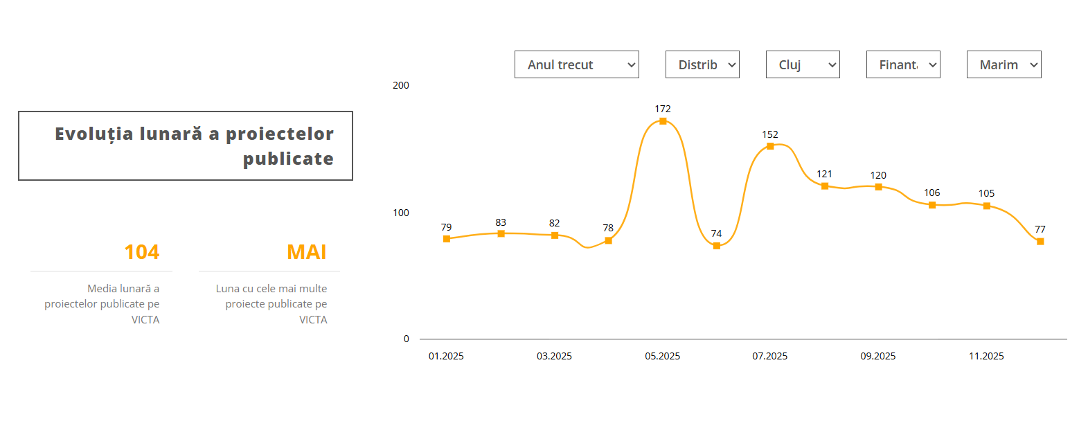 Județul Cluj se remarcă, însă, printr-o stabilitate ridicată în prima parte a anului. Între ianuarie și aprilie, valorile se mențin aproape constant (79-83-82-78). În mai, județul urcă puternic la 172 de proiecte, iar după o scădere în iunie (74), revine cu un nou vârf în iulie (152).