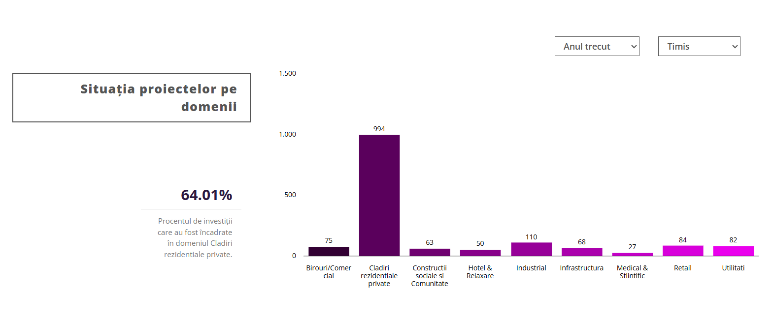 Timiș are cea mai mare dependență de rezidențial, cu 994 proiecte, adică 64,01% din total. Totuși, județul are și alte domenii consistente: industrial (110), retail (84) și utilități (82), semn că dezvoltarea nu este exclusiv locativă.