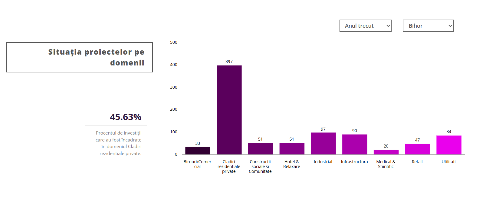 Bihor, în schimb, are cea mai mică pondere a rezidențialului: 45,63% (397 proiecte). În acest județ, industrialul (97), infrastructura (90) și utilitățile (84) au greutate reală, ceea ce sugerează o piață mai echilibrată, cu investiții care nu se sprijină predominant pe dezvoltarea locativă.
