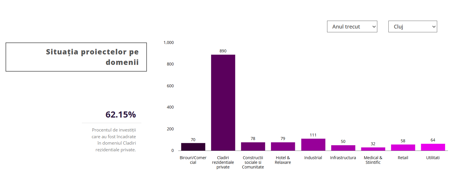 În competiția directă cu Timiș, Cluj se poziționează foarte aproape ca volum anual, cu 1.287 de proiecte, respectiv o medie lunară de 104. Diferența dintre cele două județe este relativ mică, iar dacă Timiș nu ar fi avut creșterea numărului de proiecte din octombrie, competiția ar fi fost aproape la egalitate.