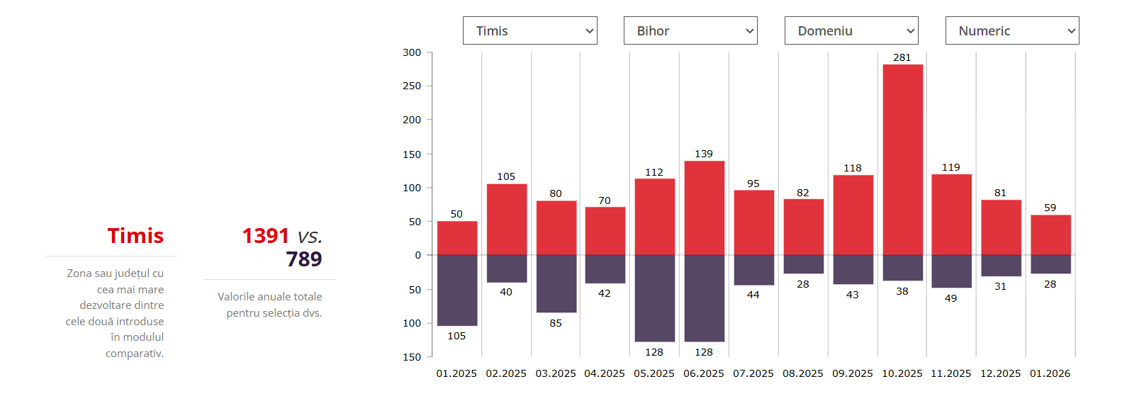 În comparația anuală, Timiș conduce detașat în fața Bihorului: 1.391 vs 789 proiecte. Deși Bihor reușește să fie foarte competitiv în mai-iunie (128 proiecte), Timiș compensează printr-o activitate mult mai mare în restul anului și, mai ales, prin vârful uriaș din octombrie (281 proiecte).