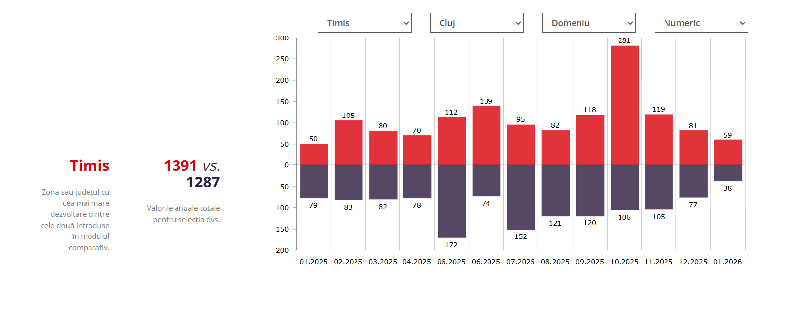 Timiș este lider prin volum și capacitatea de accelerare rapidă, dar Cluj rămâne un competitor foarte puternic prin consistență și stabilitate, iar Bihor se diferențiază printr-un mix mai echilibrat de domenii și prin vârfuri concentrate în prima parte a anului.