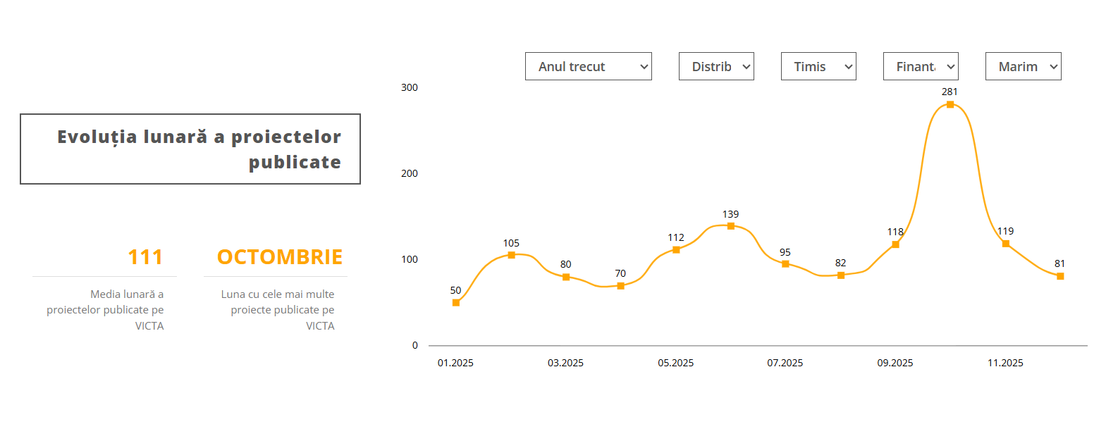 Anul începe prudent, cu 50 de proiecte în ianuarie, urmat de un salt la 105 în februarie. Primăvara rămâne într-o zonă de variații moderate, cu valori între 70 și 112 proiecte. În iunie, Timiș atinge un prim vârf consistent (139), semn că începutul verii a venit cu o intensificare a activității.