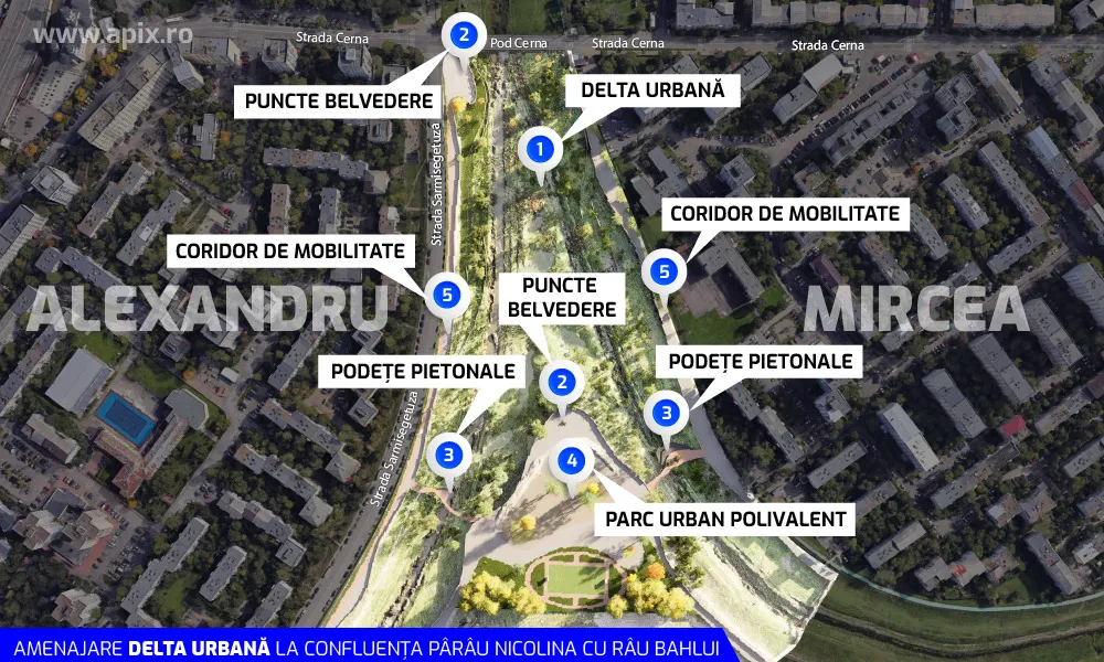Conceptul vizează transformarea unui areal aflat între cartierele Alexandru cel Bun și Mircea cel Bătrân, în zona Podului Cerna – Spitalul Arcadia, într-un parc urban multifuncțional, integrat într-o infrastructură verde-albastră.