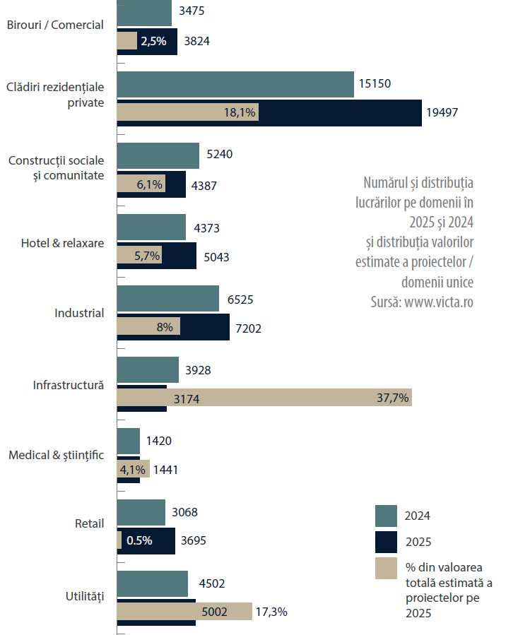 Datele aferente anului 2025 arată o piață a construcțiilor aflată într-un proces de dezvoltare constantă, cu o evoluție vizibil pozitivă pe măsură ce anul avansează. Per ansamblu, activitatea din 2025 a fost mai intensă, întrucât, din cele nouă domenii analizate, doar două (construcții sociale și comunitate și infrastructura) au înregistrat scăderi față de anul precedent.