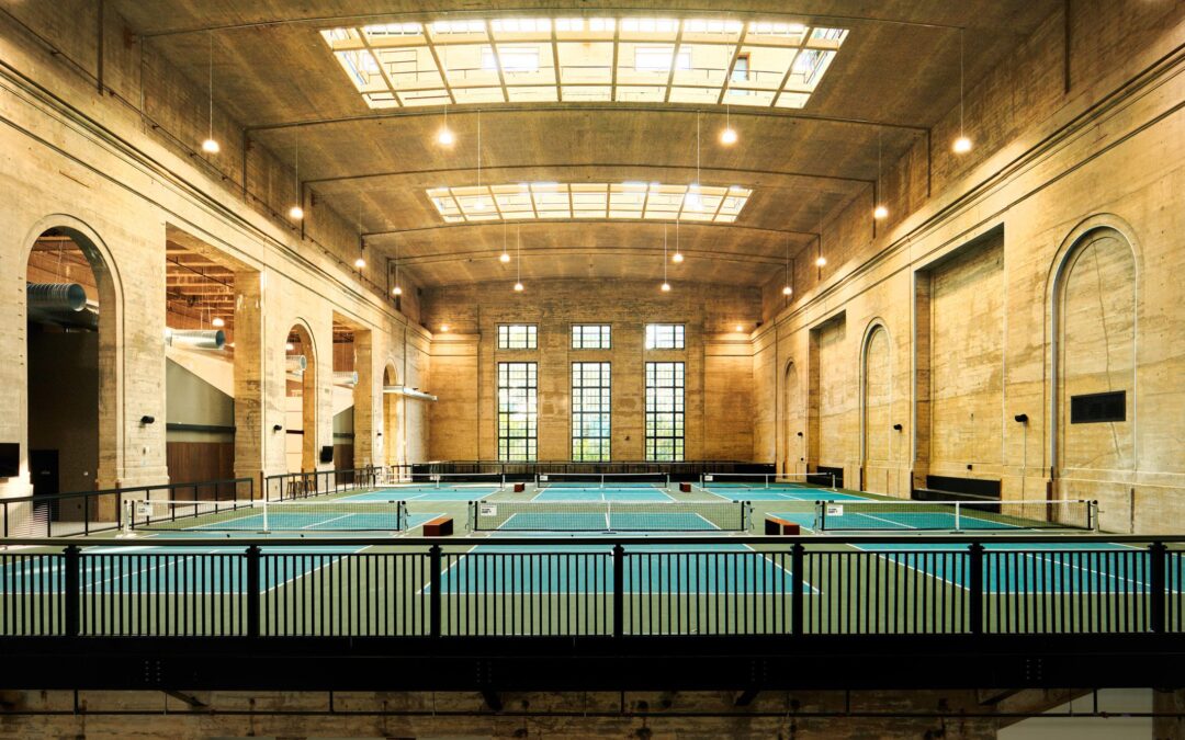 Firmele locale Good City Studio și Hexagon Studio Architects au transformat sala principală a unei centrale electrice istorice din Philadelphia într-un club sportiv numit Ballers, care include terenuri interioare pentru pickleball, fotbal și squash.
