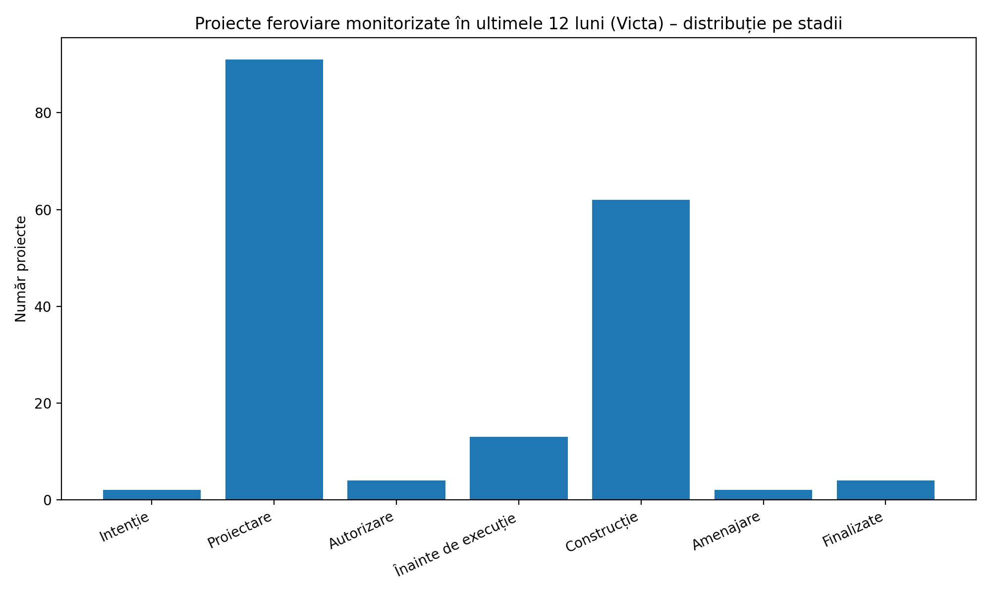 Dincolo de percepția publică, piața feroviară are o activitate consistentă, cel puțin la nivel de proiecte și planificare. Datele Victa arată că, în ultimele 12 luni, au fost monitorizate 178 de proiecte feroviare, a căror valoare este estimată la 150,82 miliarde RON.