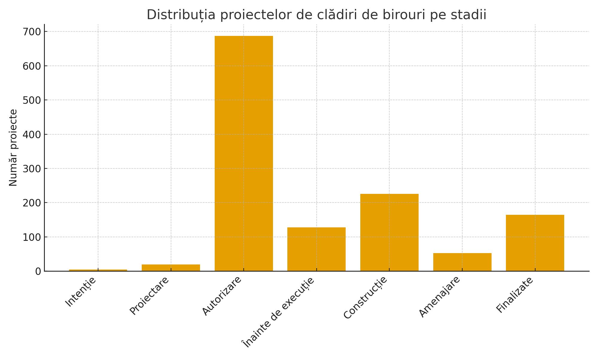 Datele Victa arată că, în ultimele 12 luni, au fost monitorizate 1.284 de proiecte de clădiri de birouri, aflate în diverse stadii de dezvoltare la nivel național. Dintre acestea: