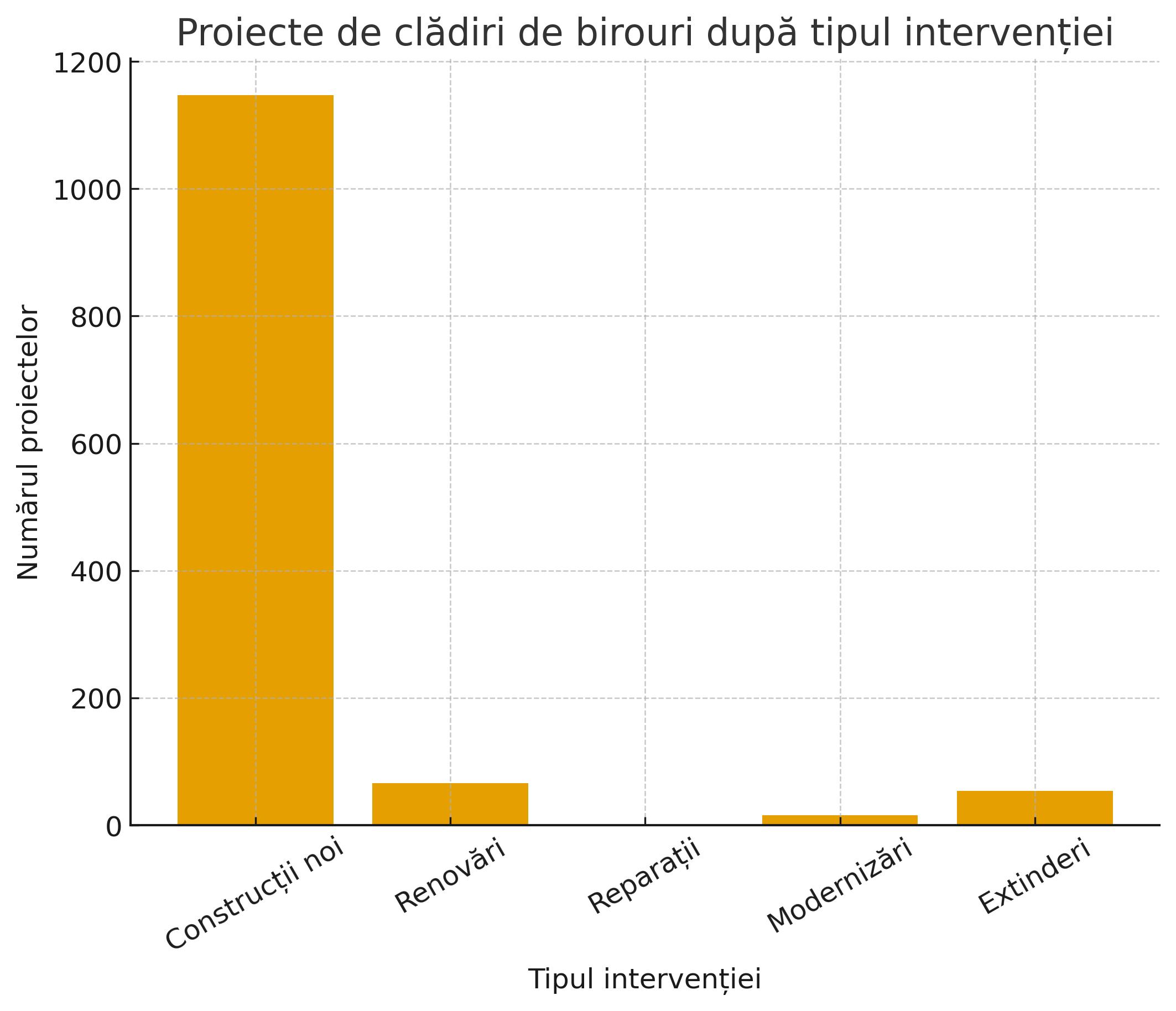 În funcție de tipul intervenției, 1.147 dintre proiecte reprezintă construcții noi, 66 sunt lucrări de renovare, o singură intervenție este încadrată la reparații, 16 la modernizări și 54 la extinderi.