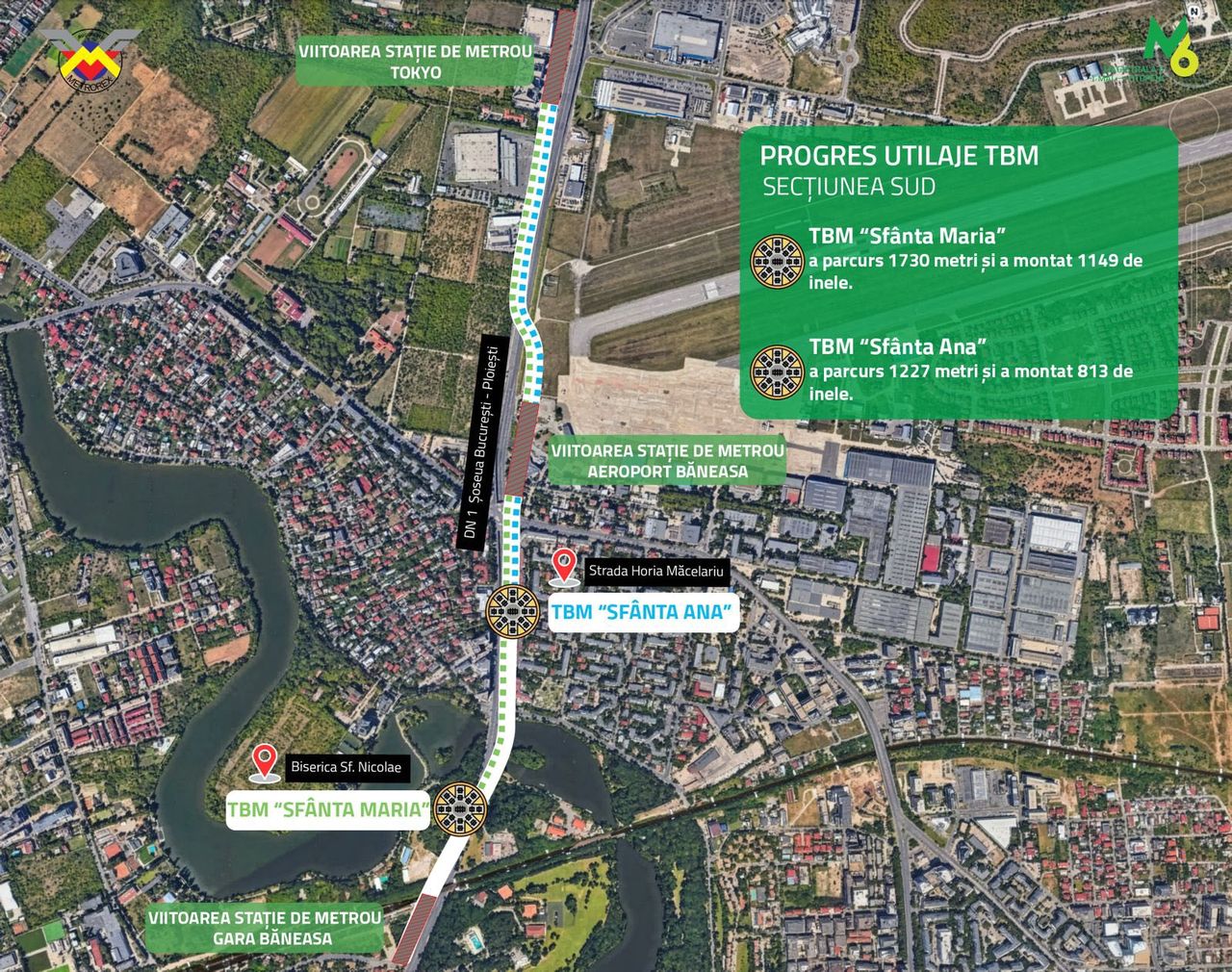 Potrivit conducerii Metrorex, avansul celor două TBM-uri mobilizate pe Secțiunea Sud se desfășoară conform graficului de execuție. „Sfânta Maria” a ajuns la Gara Băneasa, în timp ce TBM „Sfânta Ana” se apropie de aceeași stație, după ce a excavat peste 1.600 de metri de tunel și a asamblat 1.076 de inele.