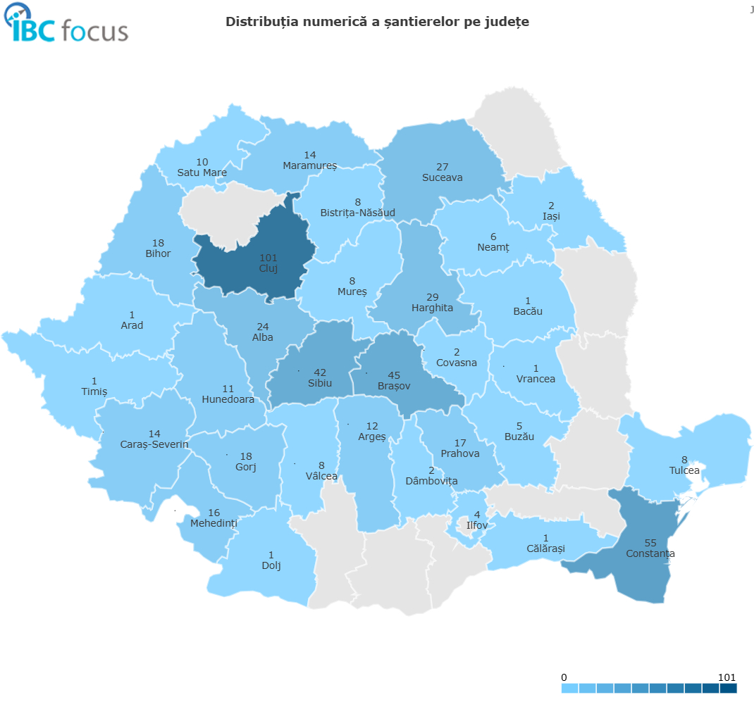 Cele mai active judeţe în acest segment sunt: Cluj (101 proiecte), Constanţa (55), Braşov (45) şi Sibiu (42). Aceste cifre indică o orientare clară către zonele montane sau litoral, dar şi către judeţe cu infrastructură bună şi potenţial turistic.