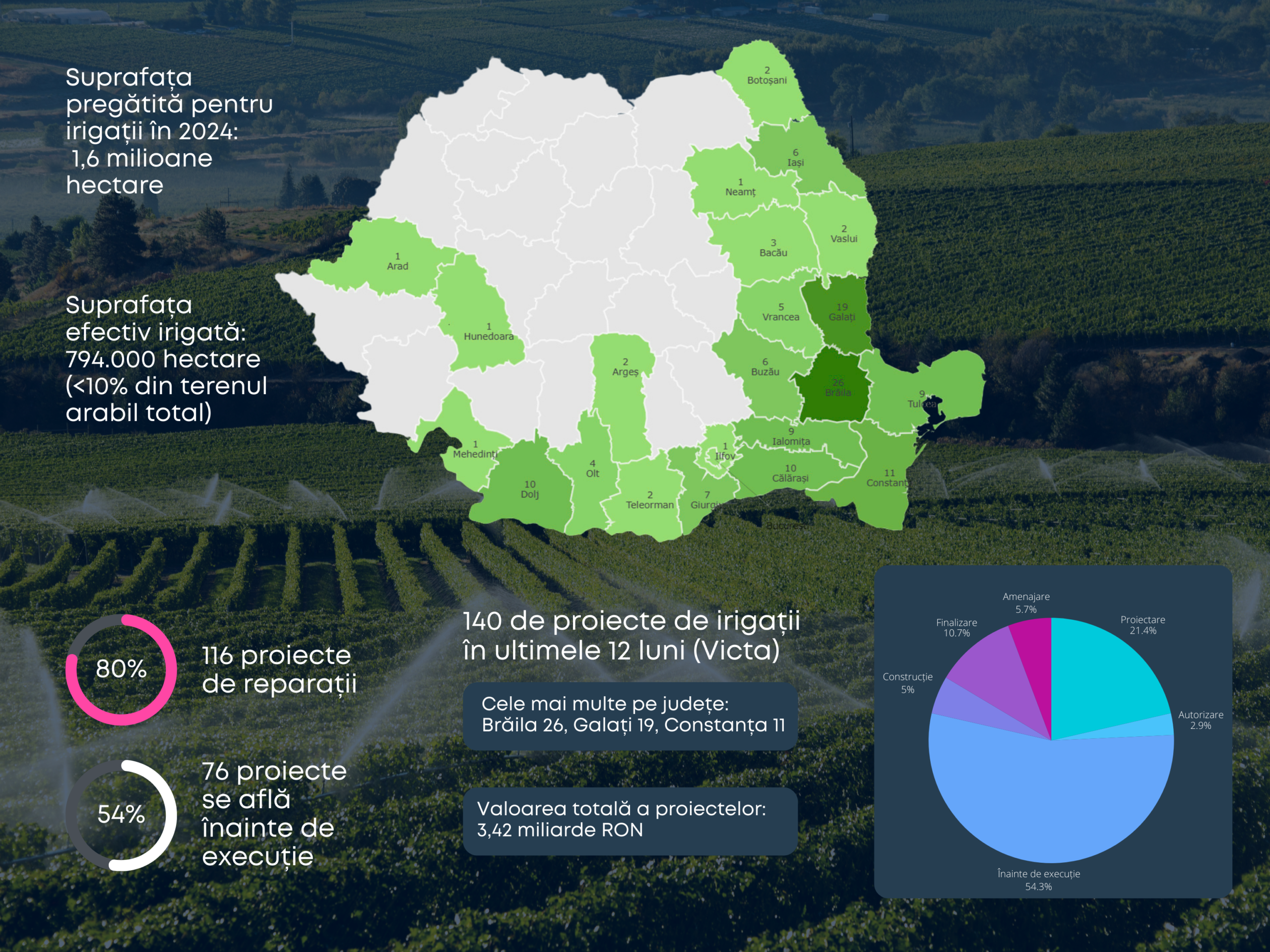 Datele Victa pentru ultimele 12 luni conturează o imagine relevantă asupra ritmului și naturii irigațiilor din România. În total, au fost monitorizate 140 de proiecte de irigații, cu o valoare cumulată estimată la 3,42 miliarde RON. Deci peste 80%, sunt lucrări de reparații ale sistemelor existente, semn că rețeaua veche (construită până în 1990) a ajuns la capătul duratei de viață fără mentenanța adecvată.