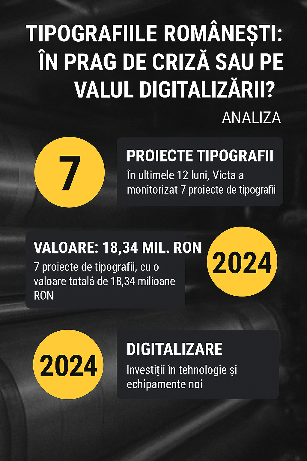 În ultimele 12 luni Victa, platformă de monitorizare a șantierelor, a înregistrat 7 proiecte de tipografii, cu o valoare totală estimată de 18,34 milioane RON și suprafață însumată de 11.655 mp.