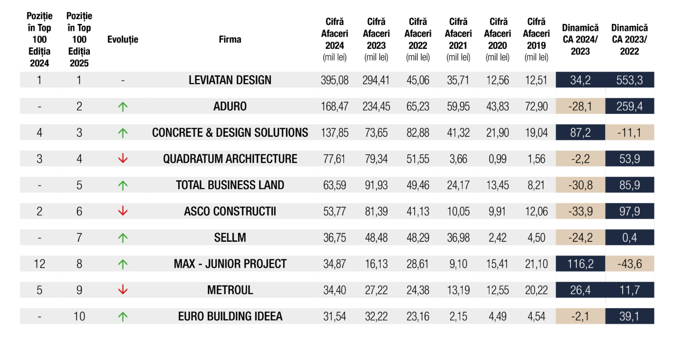 În paralel, Concrete & Design Solutions a încheiat anul cu 137,85 milioane lei cifră de afaceri, în creștere cu 87,2% față de 2023, o performanță remarcabilă, alimentată de progresul constant din ultimii ani și de capacitatea de a livra constant pe segmente cu cerere solidă. De notat și parcursul Leviatan Design, liderul clasamentului, care după un spectaculos +553,3% al cifrei de afaceri în 2023, a adăugat încă +34,2% în 2024, semn că, deși ritmul se normalizează, baza rămâne foarte puternică.