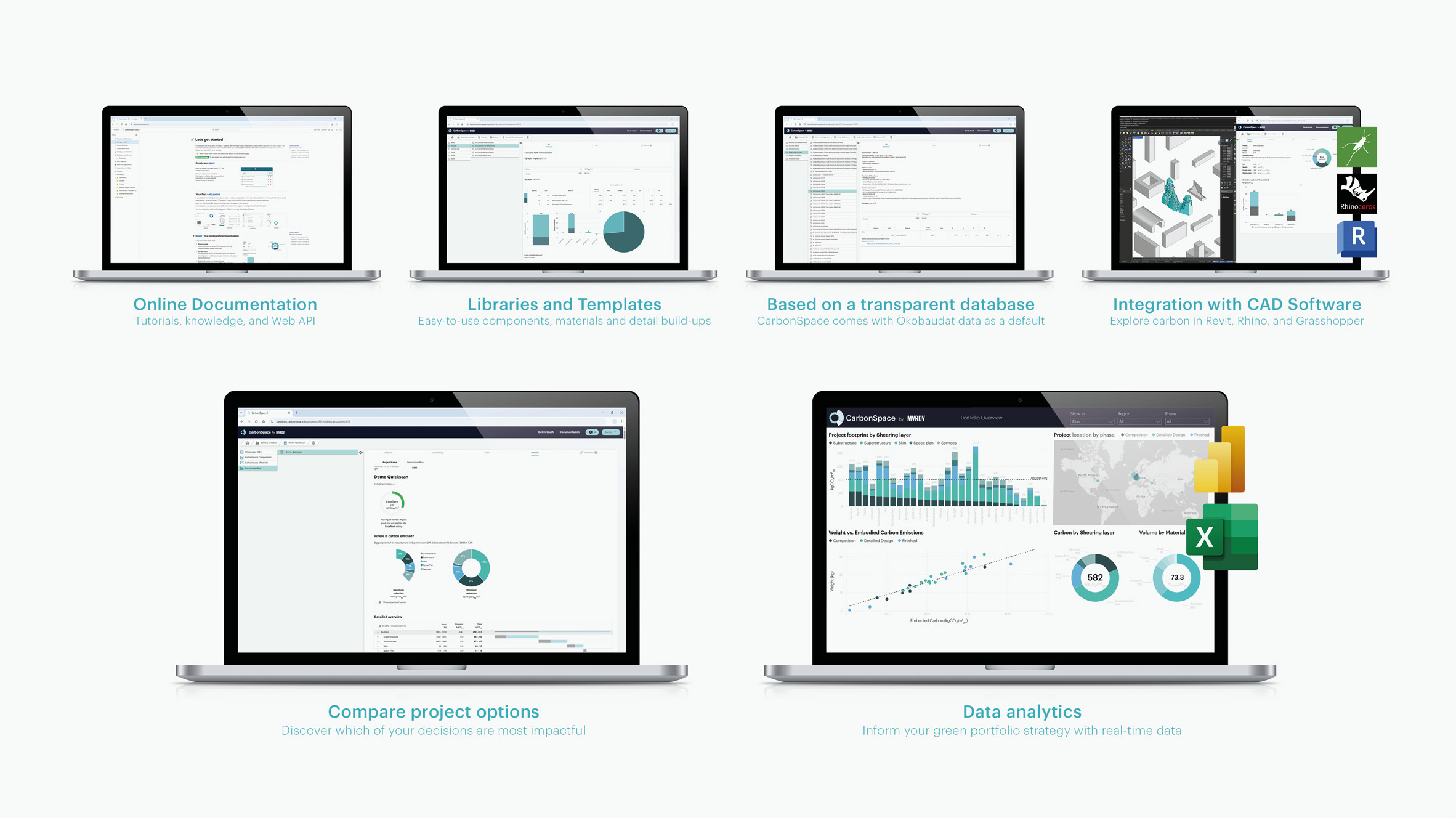 Datorită unui API deschis, CarbonSpace poate fi conectat la programe populare precum Rhino, Revit sau Microsoft Power BI, facilitând analiza și vizualizarea datelor.