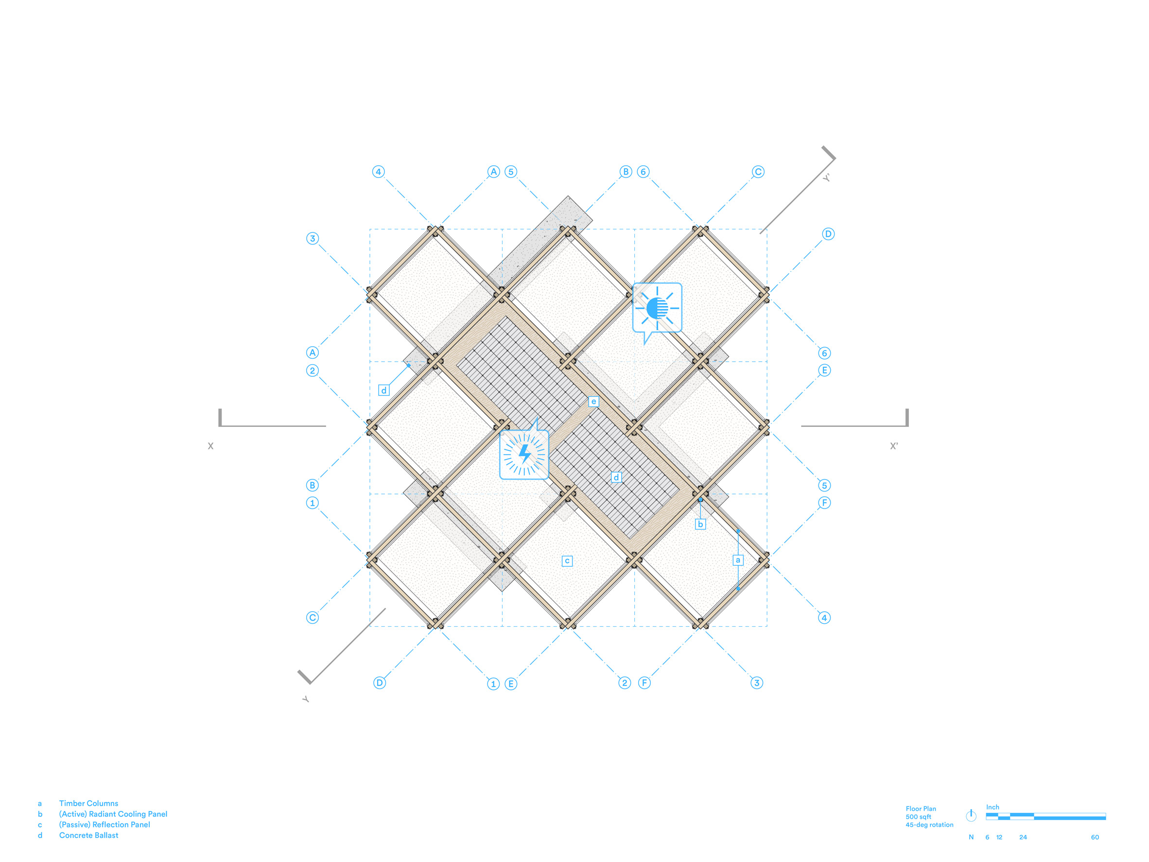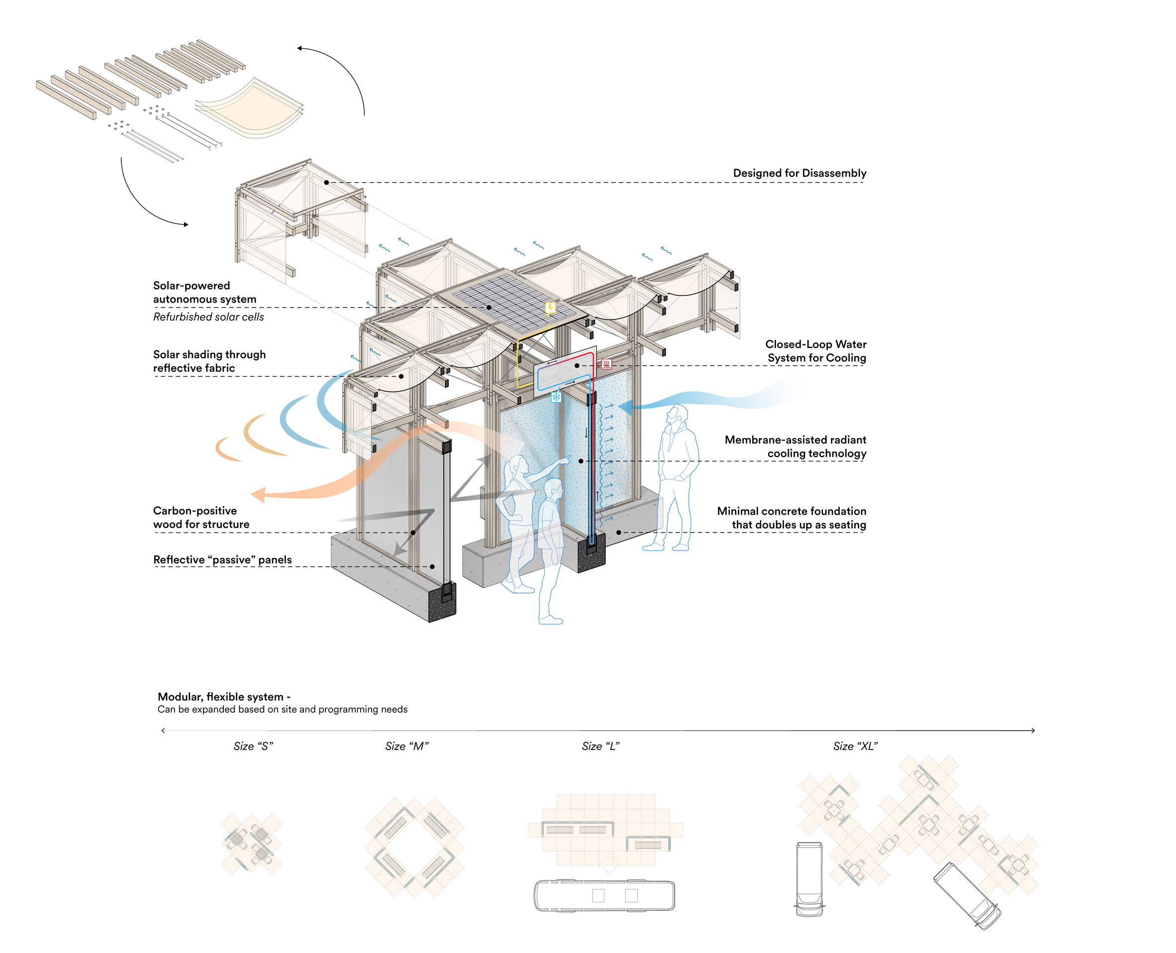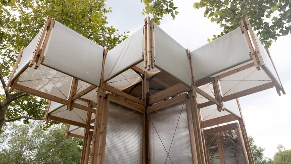 Acoperișul este construit din cuburi din lemn de 1,2 x 1,2 metri, acoperite cu pânză pentru umbrire suplimentară. Structura folosește Carbon Smart Wood, un tip de lemn de cedru reciclat, ales pentru amprenta redusă de carbon și pentru ușurința cu care poate fi demontat.